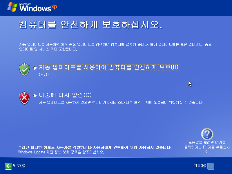 자동 업데이트를 사용할 것인지 물어봅니다. 어차피 지금은 업데이트를 받을 수 없지만 그냥 해줍시다.