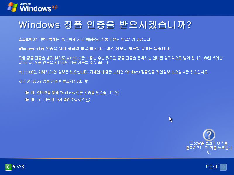 정품 인증을 받을 것인지 물어봅니다. 지원 종료된 이 시점에 인터넷을 통해서 받을 순 없습니다.