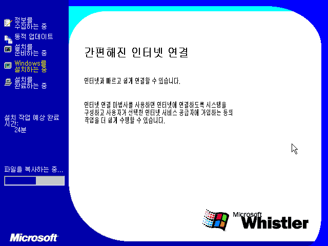 윈도우 휘슬러 베타 1의 설치를 계속합니다. 설치 화면은 윈도우 98이나 Me 같네요. 글씨가 뭔가 좀 찌부된 느낌이 듭니다.