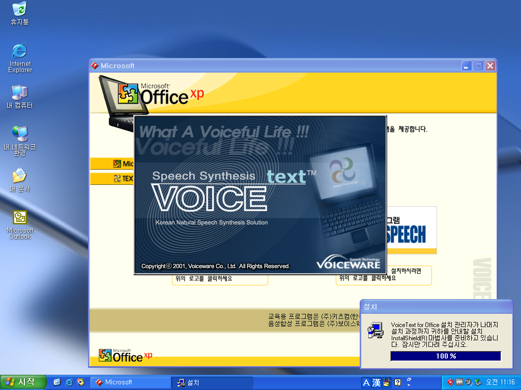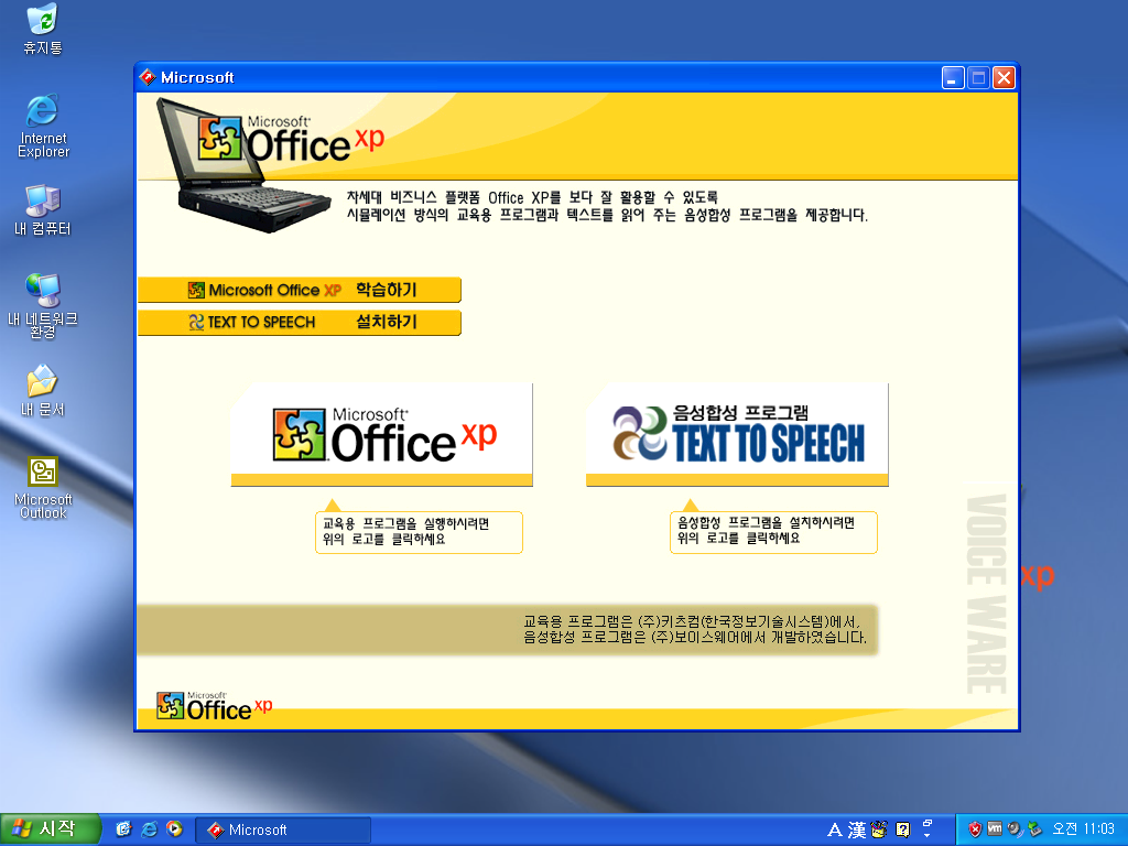 마지막으로 Learning & TTS라는 디스크가 있습니다. 이걸 넣어주면 이런 창이 뜹니다. 오피스 XP 교육용 프로그램을 실행하거나, 음성합성 프로그램을 설치할 수 있습니다.