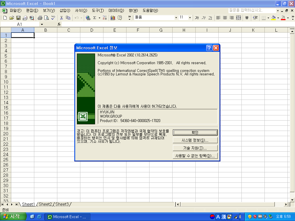 엑셀 정보입니다. 버전 2002입니다. 빌드 넘버는 10.2614.2625입니다.