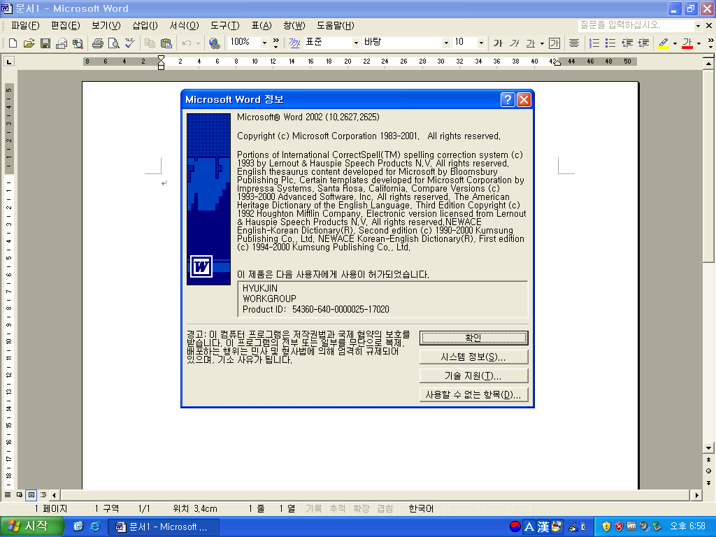 워드 정보입니다. 버전 2002입니다. 빌드 넘버는 10.2627.2625입니다.