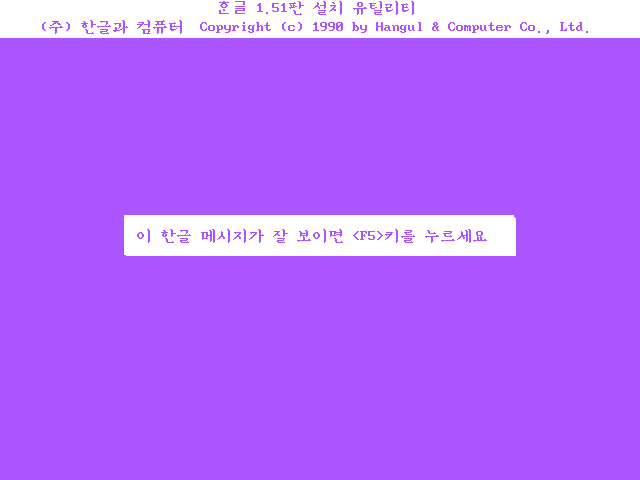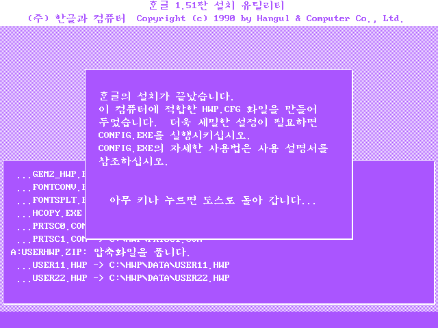 한글과컴퓨터 한글 1.51판 설치를 진행합니다. 아무 키나 누릅니다.
