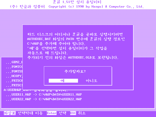 autoexec.bat 파일에 한글 실행 경로를 추가하는 작업입니다. 예를 누릅니다.