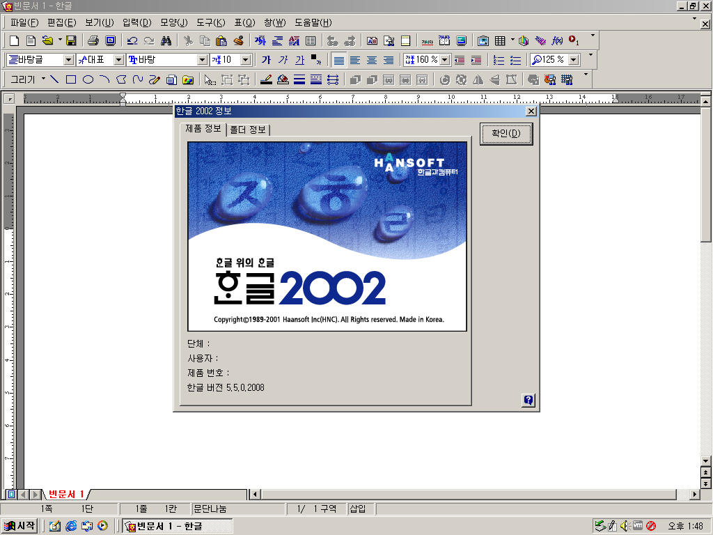 한글 2002 초판의 정보입니다. 버전이 5.5.0.2008입니다.