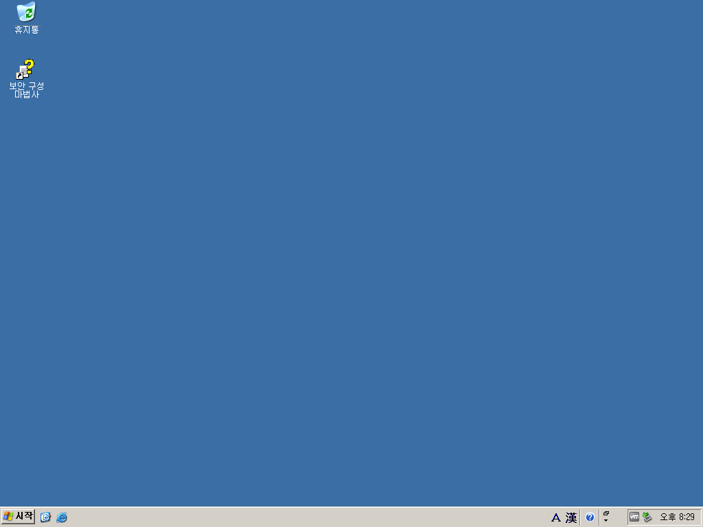 그래픽 드라이버를 잡은 후의 모습입니다. 휴지통과 보안 구성 마법사 두 개만 있는 바탕화면이 너무 공허합니다.