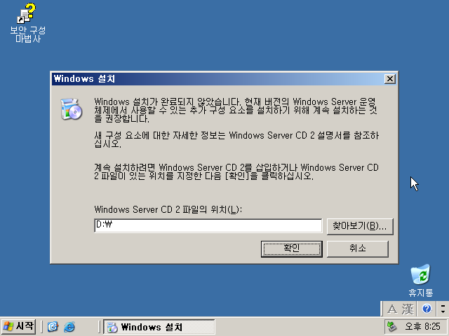 R2는 설치 CD가 2장입니다. 2번 CD를 넣고 확인을 누릅니다.
