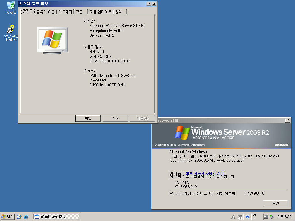 시스템 등록 정보입니다. 윈도우 서버 2003 R2 엔터프라이즈 64비트 에디션입니다. 빌드 넘버는 5.2.3790입니다. 서비스 팩 2가 설치되어 있습니다.