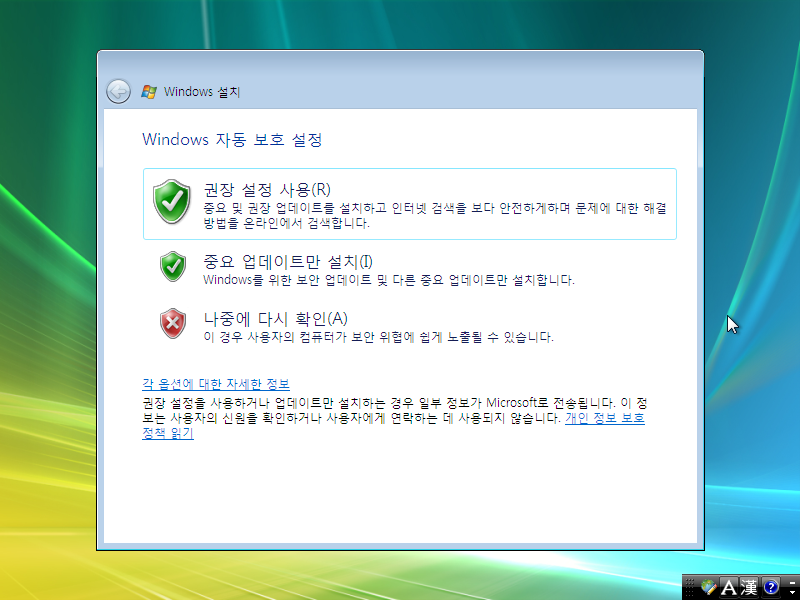 업데이트 설정입니다. 권장 설정 사용을 선택합니다.