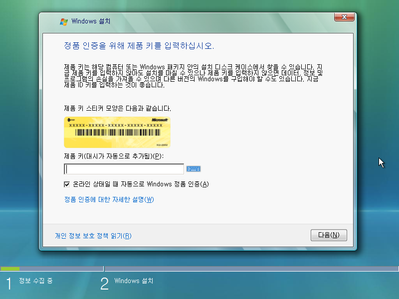 정품 키를 입력하면 키에 맞는 에디션이 자동으로 선택되어 설치되므로, 넘어갑시다.