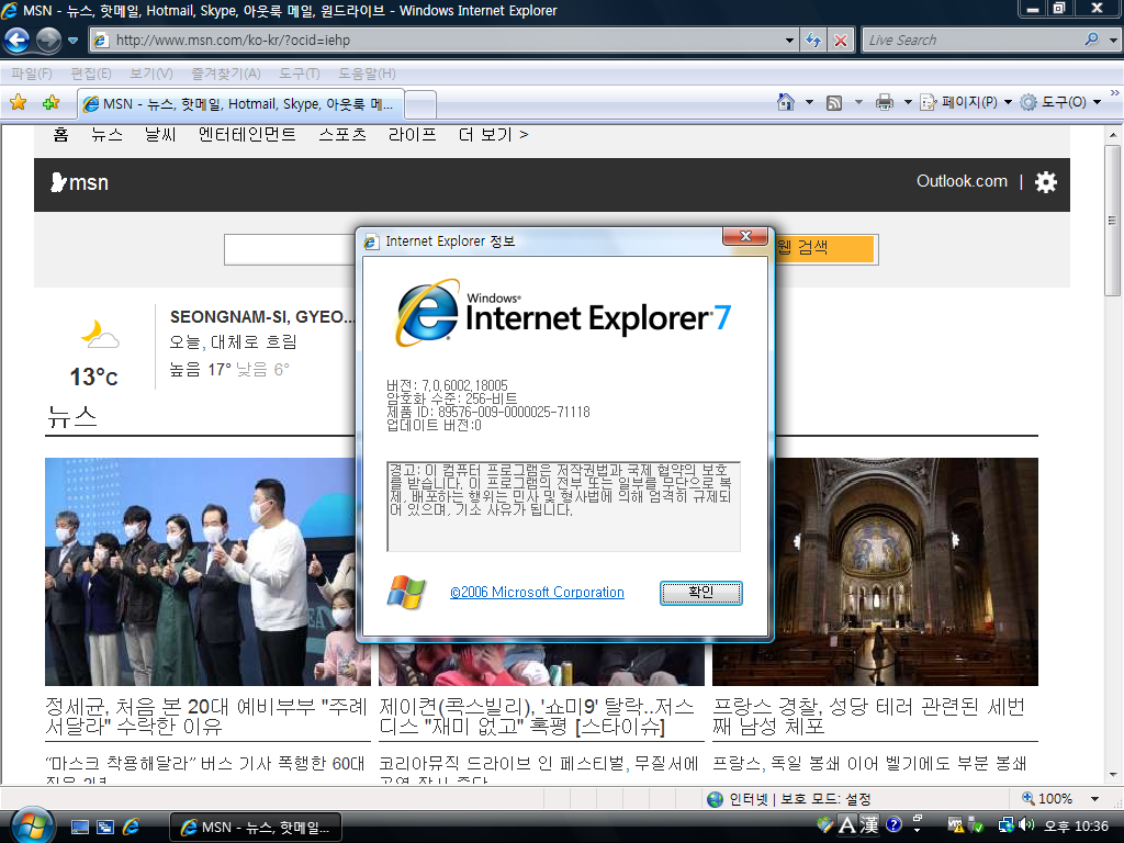 인터넷 익스플로러입니다. 버전 7.0이고, 빌드 넘버는 7.0.6002.18005입니다. 윈도우 비스타는 IE 9까지 지원합니다.