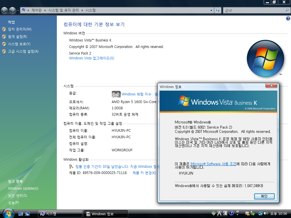 시스템 등록 정보입니다. 윈도우 비스타 비즈니스 K입니다. 빌드 넘버는 6.0.6002입니다. 서비스 팩 2가 설치되어 있습니다.