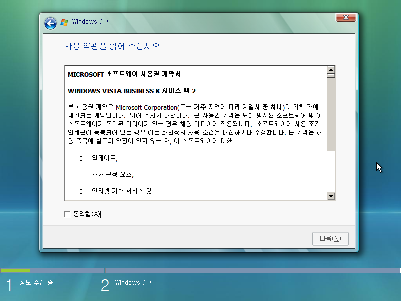 윈도우 비스타를 설치합니다. 다음을 누릅니다.