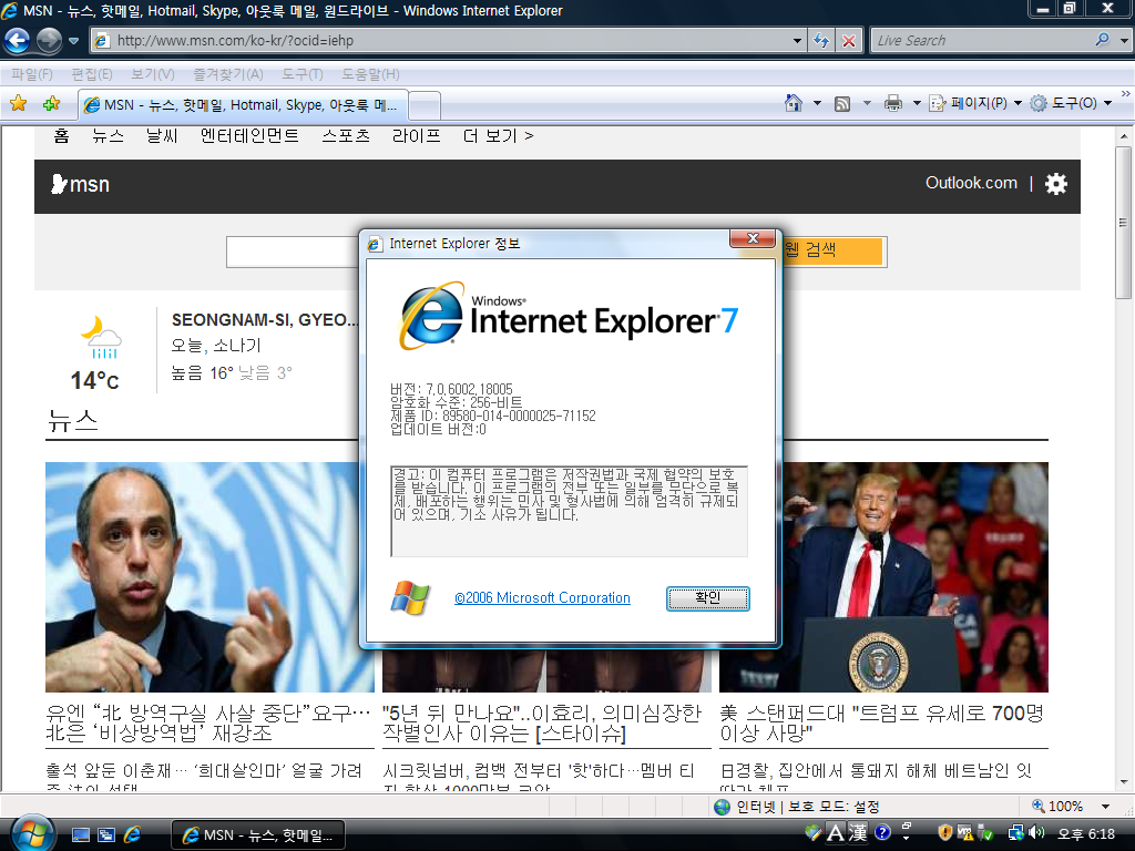 인터넷 익스플로러입니다. 버전 7.0이고, 빌드 넘버는 7.0.6002.18005입니다. 윈도우 비스타는 IE 9까지 지원합니다.