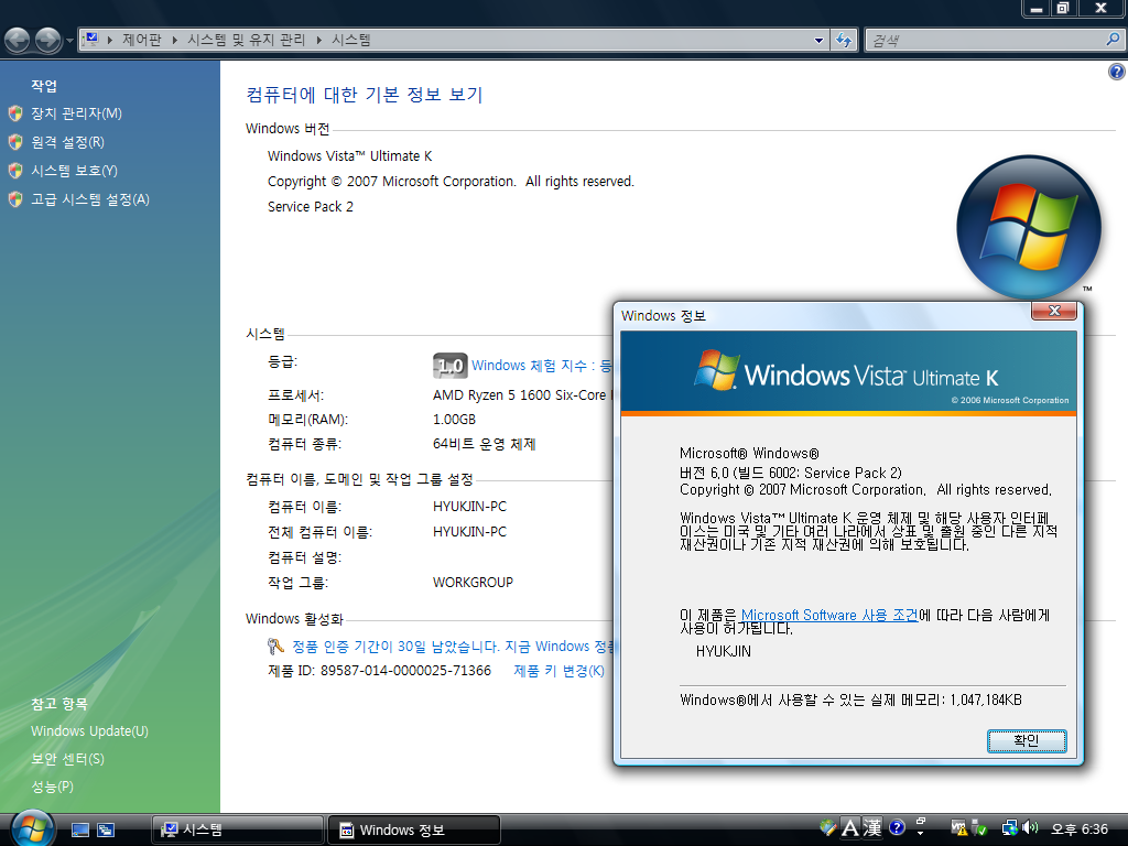 시스템 등록 정보입니다. 윈도우 비스타 얼티밋 K입니다. 빌드 넘버는 6.0.6002입니다. 서비스 팩 2가 설치되어있습니다.