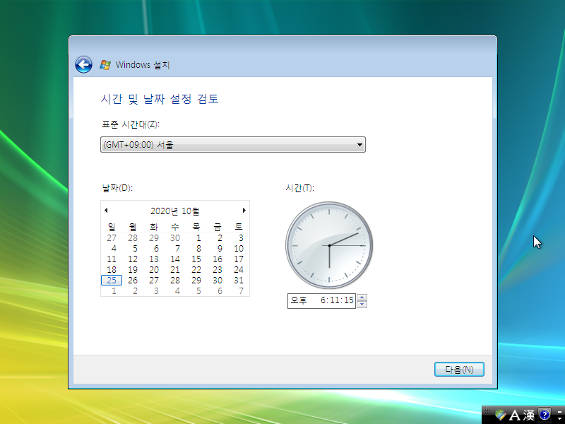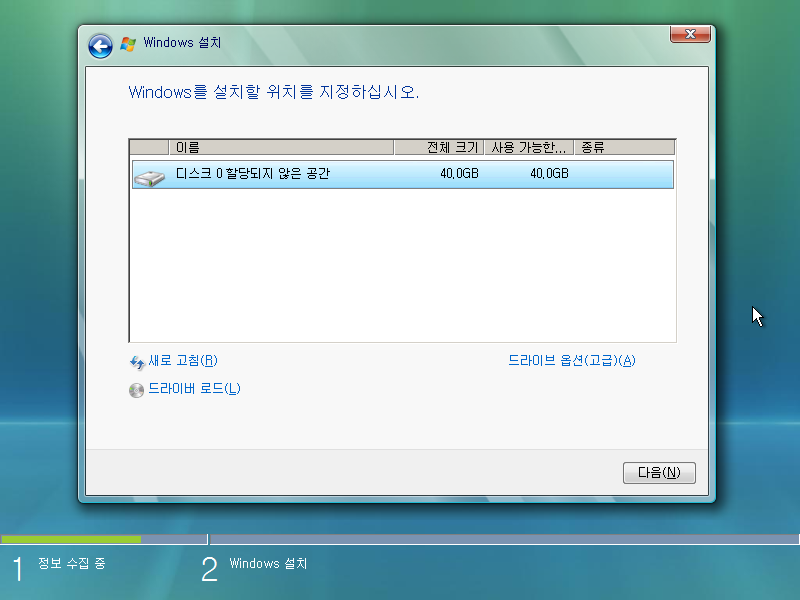 윈도우 비스타 설치를 시작합니다. 다음을 누릅니다.
