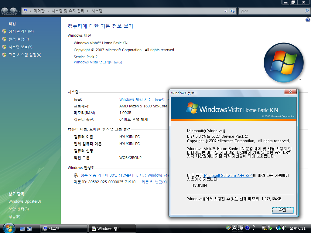 시스템 등록 정보입니다. 윈도우 비스타 홈 베이직 KN입니다. 빌드 넘버는 6.0.6002입니다. 서비스 팩 2가 설치되어있습니다.