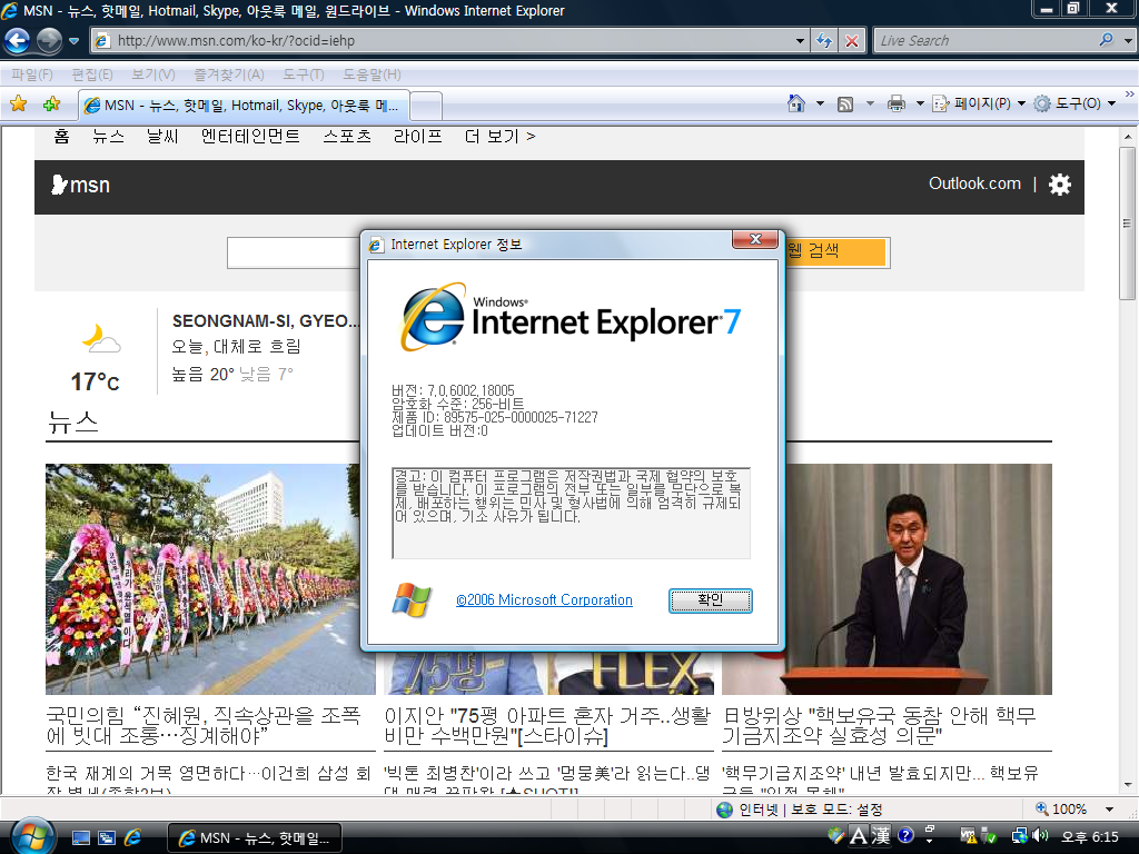 인터넷 익스플로러입니다. 버전 7.0이고, 빌드 넘버는 7.0.6002.18005입니다. 윈도우 비스타는 IE 9까지 지원합니다.