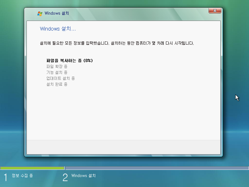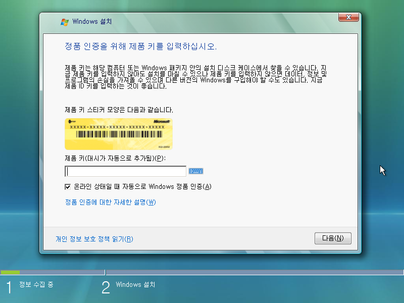 윈도우 비스타 설치를 시작합니다. 다음을 누릅니다.