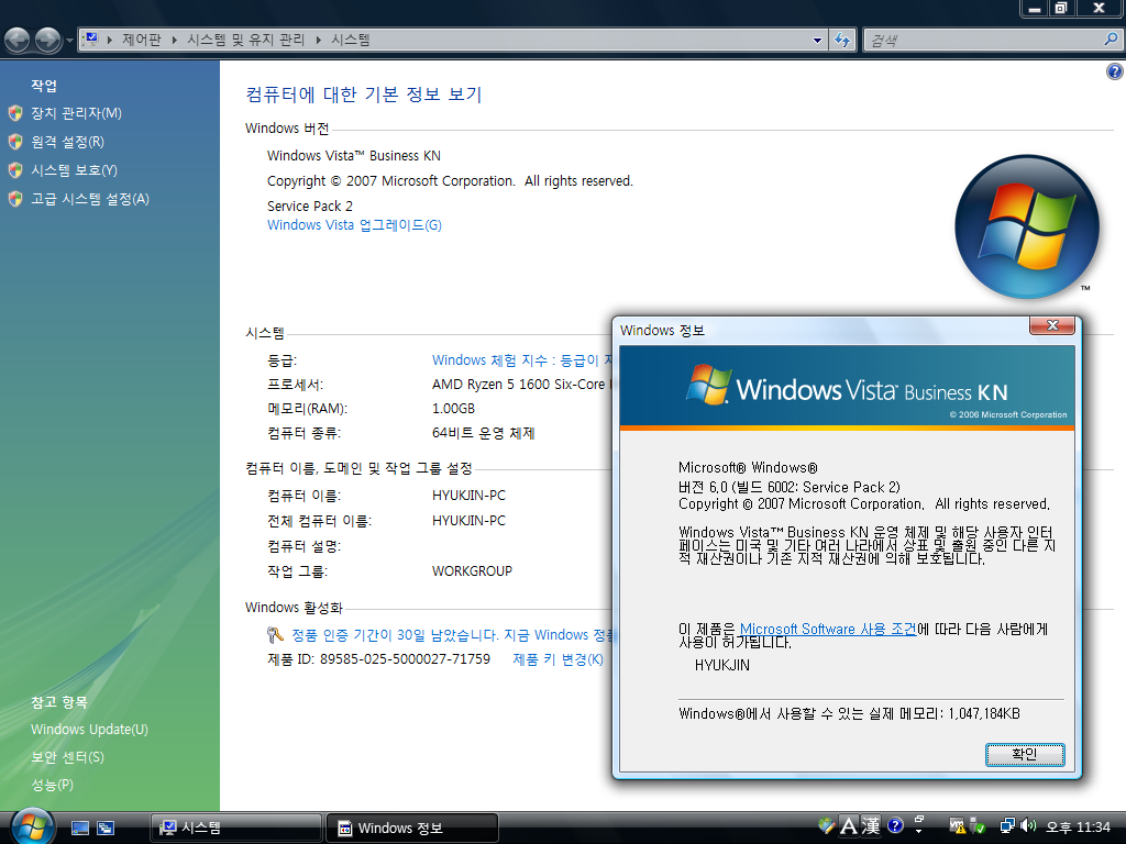 시스템 등록 정보입니다. 윈도우 비스타 비즈니스 KN입니다. 빌드 넘버는 6.0.6002입니다. 서비스 팩 2가 설치되어있습니다.