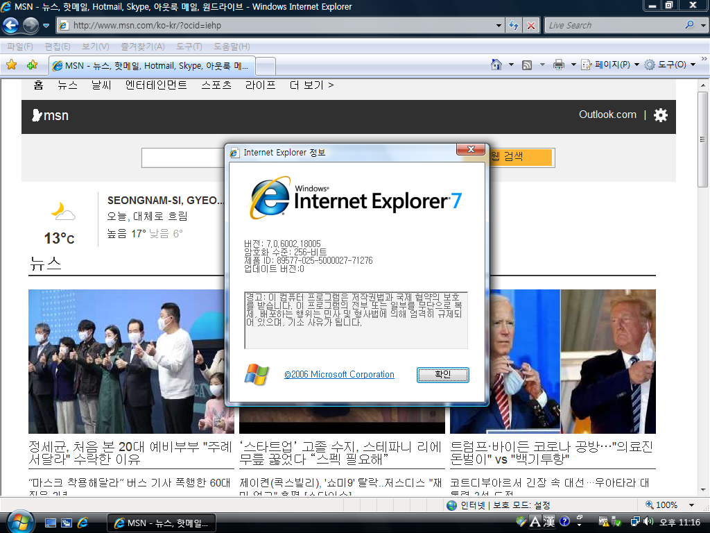 인터넷 익스플로러입니다. 버전 7.0이고, 빌드 넘버는 7.0.6002.18005입니다. 윈도우 비스타는 IE 9까지 지원합니다.