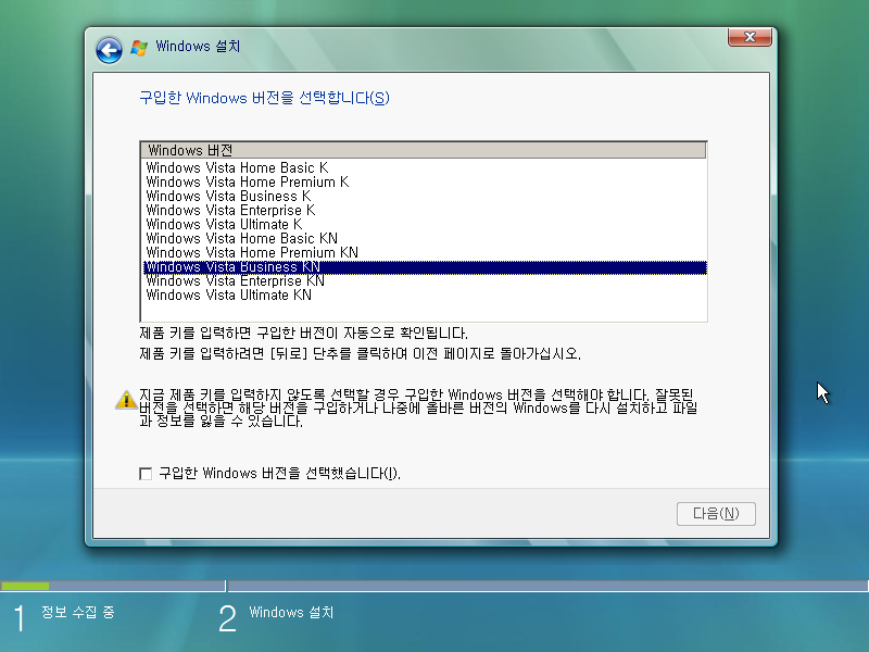 Windows Vista Business KN을 설치해보았습니다. 비즈니스 KN도 비즈니스 K에서 메신저와 미디어 기능이 빠진 버전입니다.