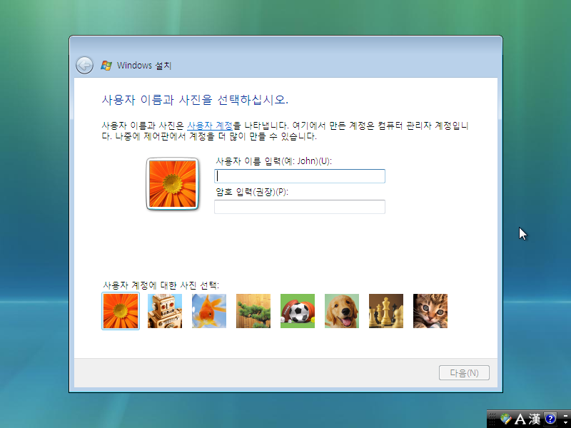 다시 한번 시스템을 재시작한 후 사용자 이름과 암호를 입력하고, 사용자 계정에 쓸 사진을 선택합니다.