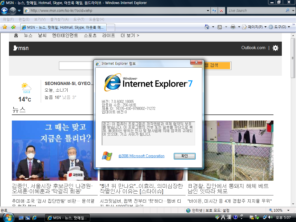 인터넷 익스플로러입니다. 버전 7.0이고, 빌드 넘버는 7.0.6002.18005입니다. 윈도우 비스타는 IE 9까지 지원합니다.