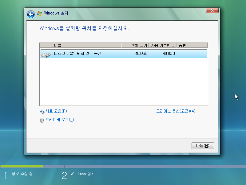 윈도우를 설치할 공간을 선택합니다.