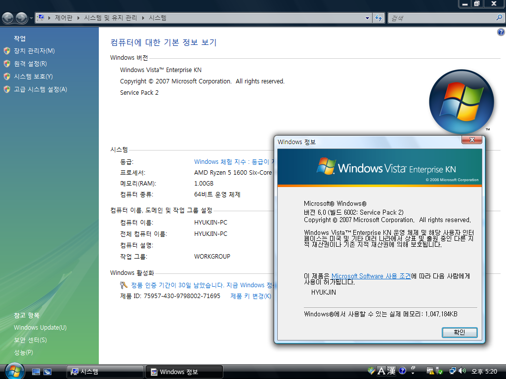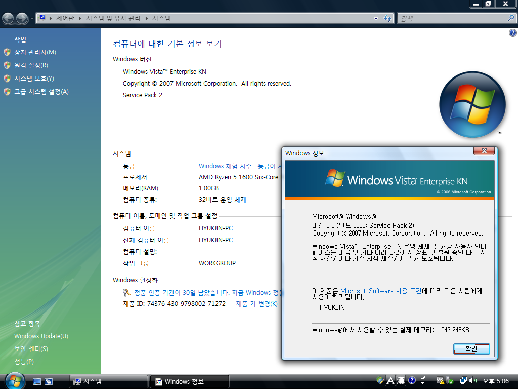 시스템 등록 정보입니다. 윈도우 비스타 엔터프라이즈 KN입니다. 빌드 넘버는 6.0.6002입니다. 서비스 팩 2가 설치되어있습니다.