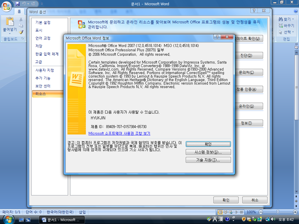 워드 정보입니다. 버전 2007입니다. 빌드 넘버는 12.0.4518.1014입니다.