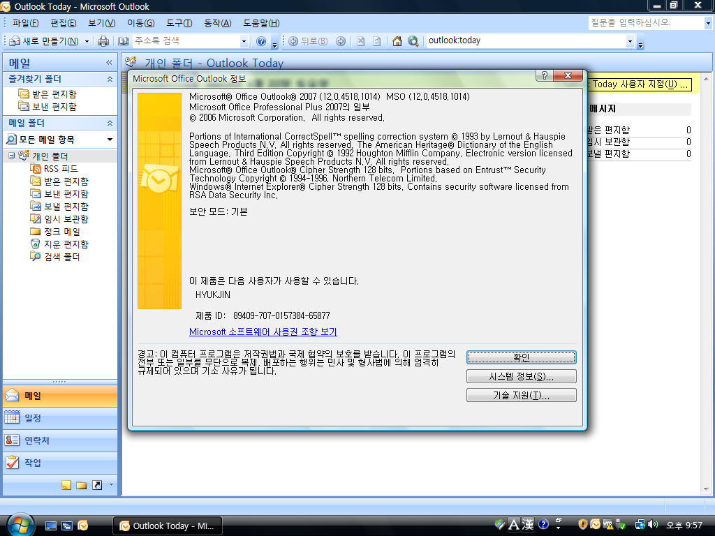 아웃룩 정보입니다. 버전 2007입니다. 빌드 넘버는 12.0.4518.1014입니다.