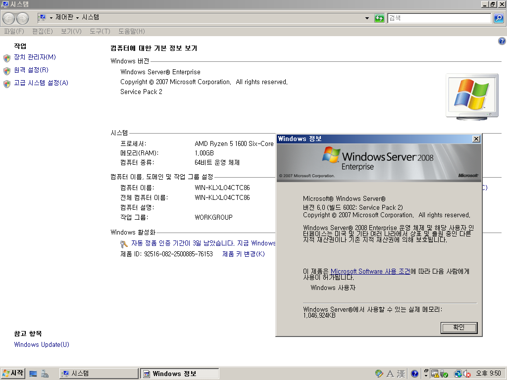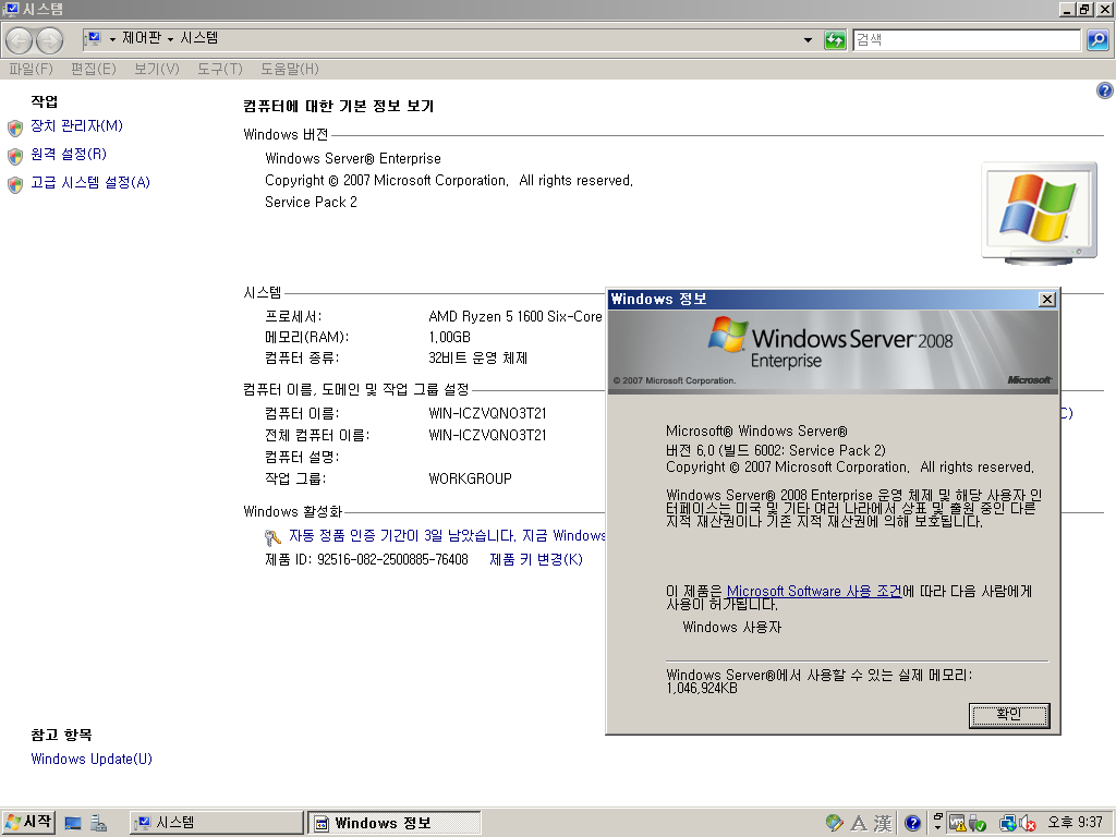 시스템 등록 정보입니다. 윈도우 서버 2008 엔터프라이즈 에디션입니다. 빌드 넘버는 6.0.6002입니다. 서비스 팩 2가 설치되어있습니다.