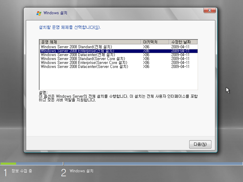 설치할 에디션을 선택합니다. 엔터프라이즈 에디션 (전체 설치)을 선택합니다.