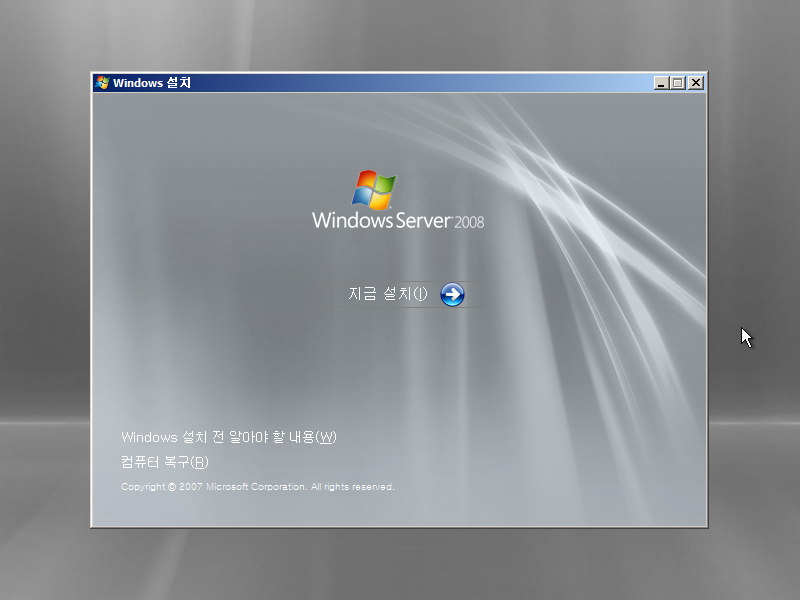 윈도우 서버 2008 설치를 시작합니다. 다음을 누릅니다.