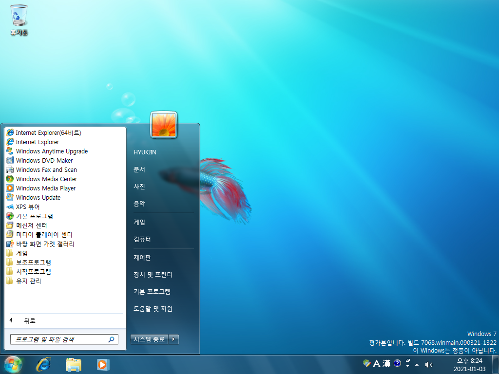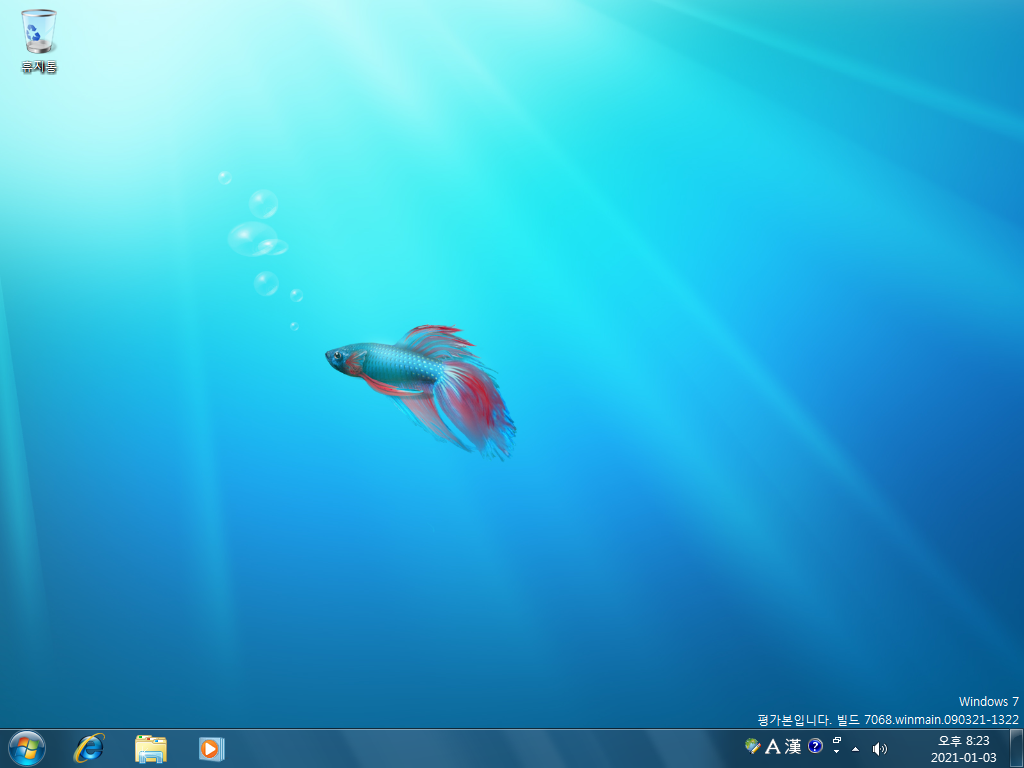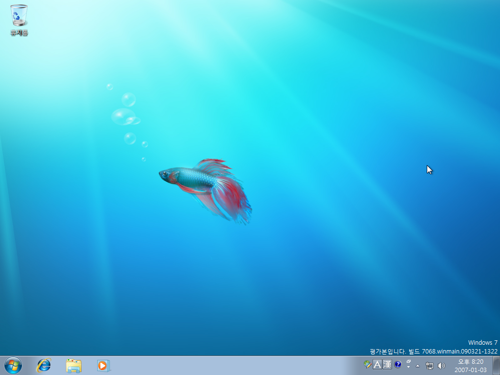 설치가 끝난 모습입니다. 베타피쉬가 저희를 반겨주네요. 우측 하단에는 평가본, 빌그 7068이라는 문구가 있습니다.
