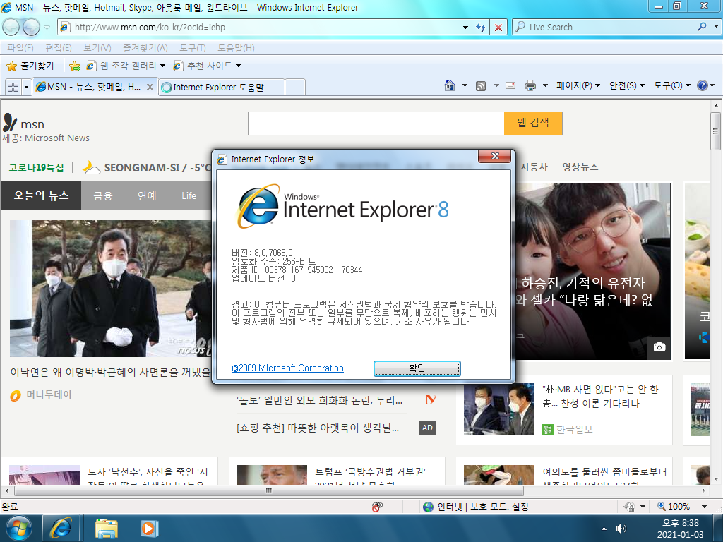 인터넷 익스플로러입니다. 버전 8.0이고, 빌드 넘버는 8.0.7068.0입니다.
