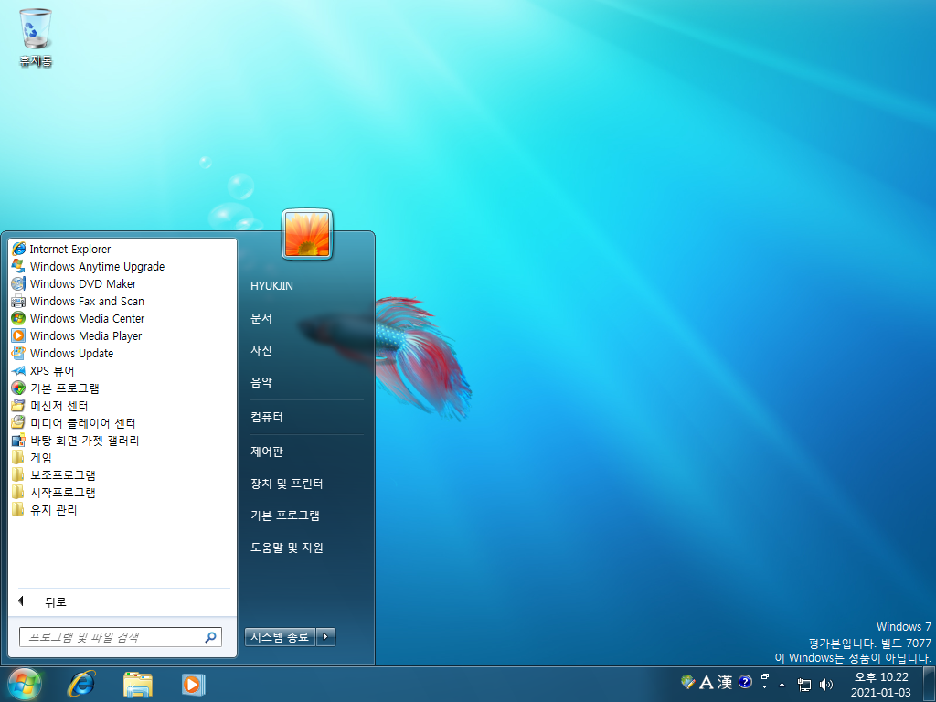 시작 메뉴를 열어보았습니다. 윈도우 비스타보다 새로운 여러가지가 생긴 것 같습니다.