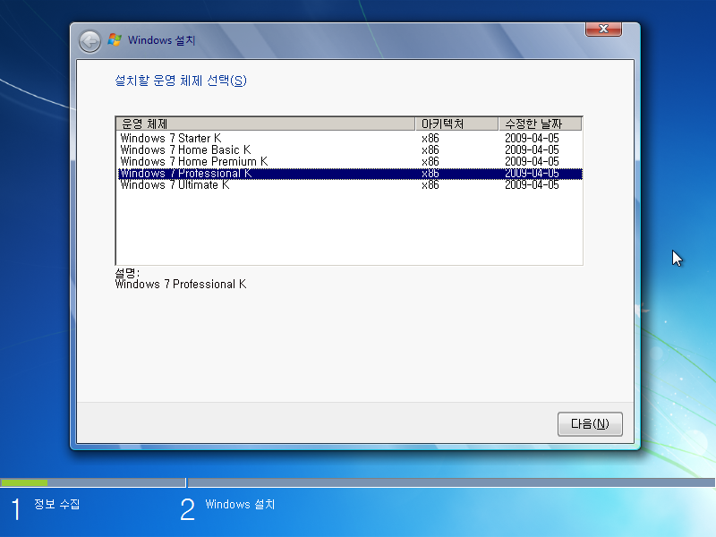 에디션을 선택합니다. 프로페셔널 K를 선택합니다.