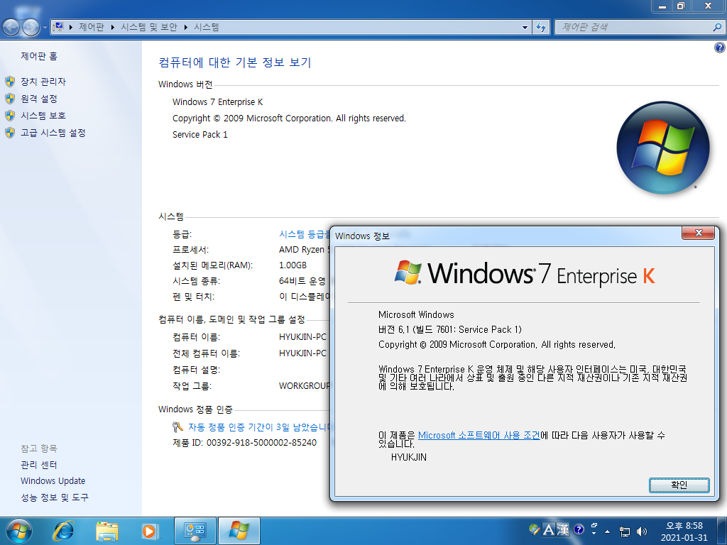 시스템 등록 정보입니다. 윈도우 7 엔터프라이즈 K입니다. 빌드 넘버는 6.1.7601입니다. 서비스 팩 1이 설치되어 있습니다.