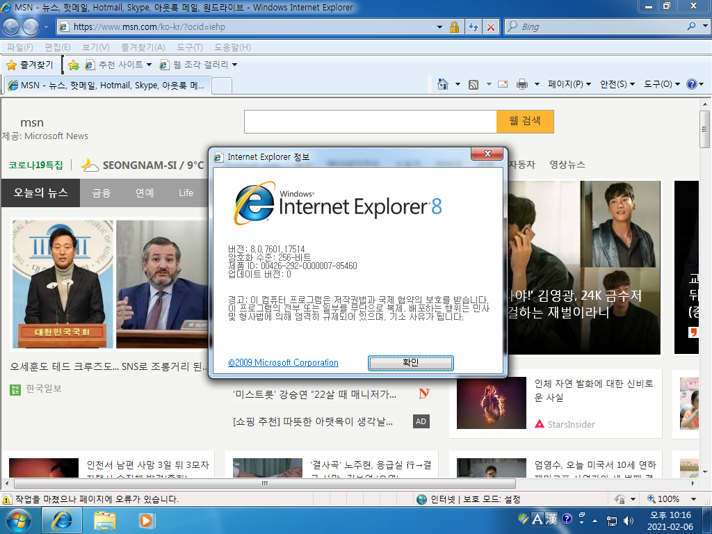 인터넷 익스플로러입니다. 버전 8이고, 빌드 넘버는 8.0.7601.17514입니다. 윈도우 7은 IE 11까지 지원합니다.