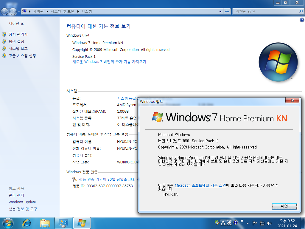 시스템 등록 정보입니다. 윈도우 7 홈 프리미엄 KN입니다. 빌드 넘버는 6.1.7601입니다. 서비스 팩 1이 설치되어 있습니다.
