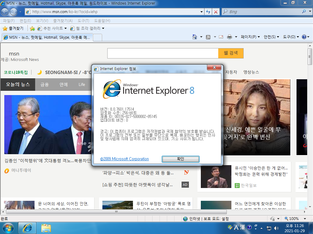 인터넷 익스플로러입니다. 버전 8이고, 빌드 넘버는 8.0.7601.17514입니다. 윈도우 7은 IE 11까지 지원합니다.