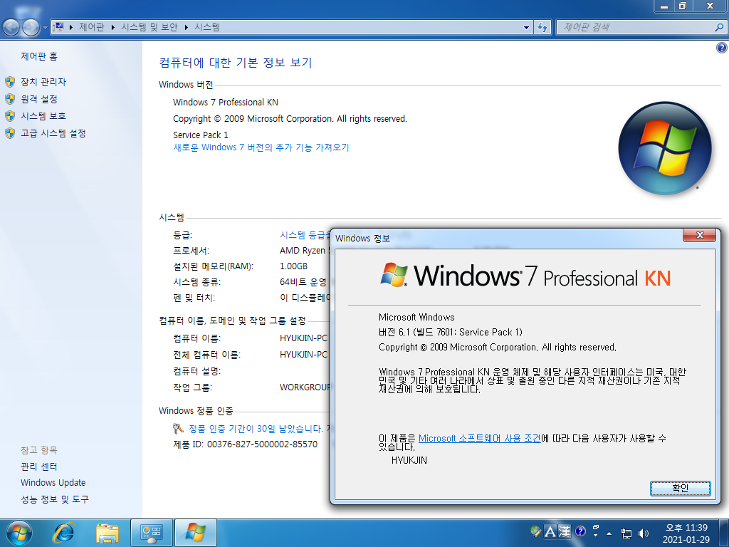시스템 등록 정보입니다. 윈도우 7 프로페셔널 KN입니다. 빌드 넘버는 6.1.7601입니다. 서비스 팩 1이 설치되어 있습니다.