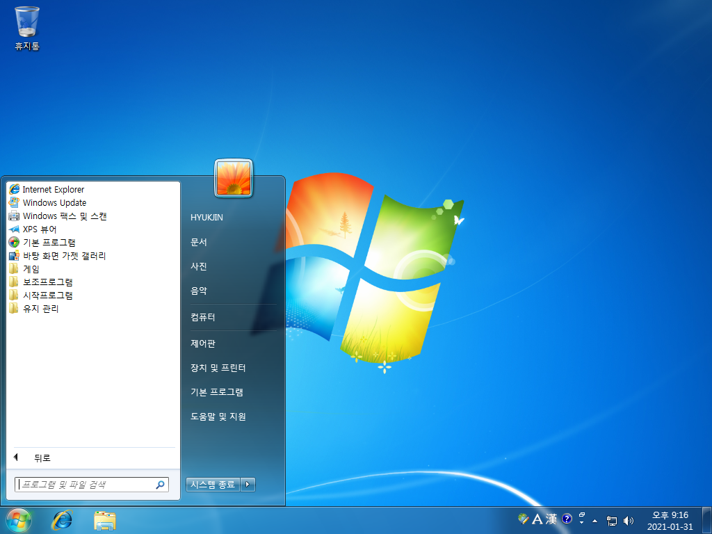 시작 메뉴를 열어보았습니다. KN 버전이라서 그런지 프로그램이 많지는 않습니다.