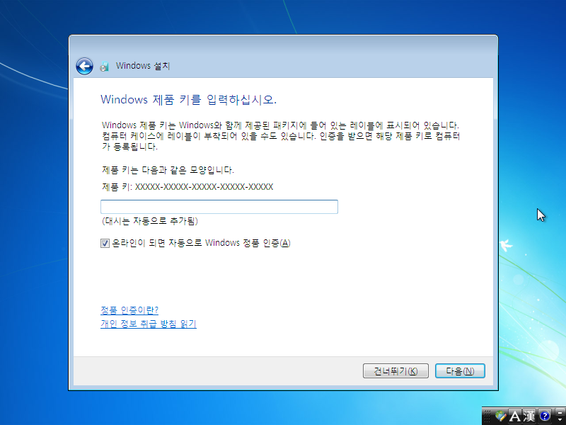제품 키를 입력합니다. 나중에 입력하셔도 됩니다.
