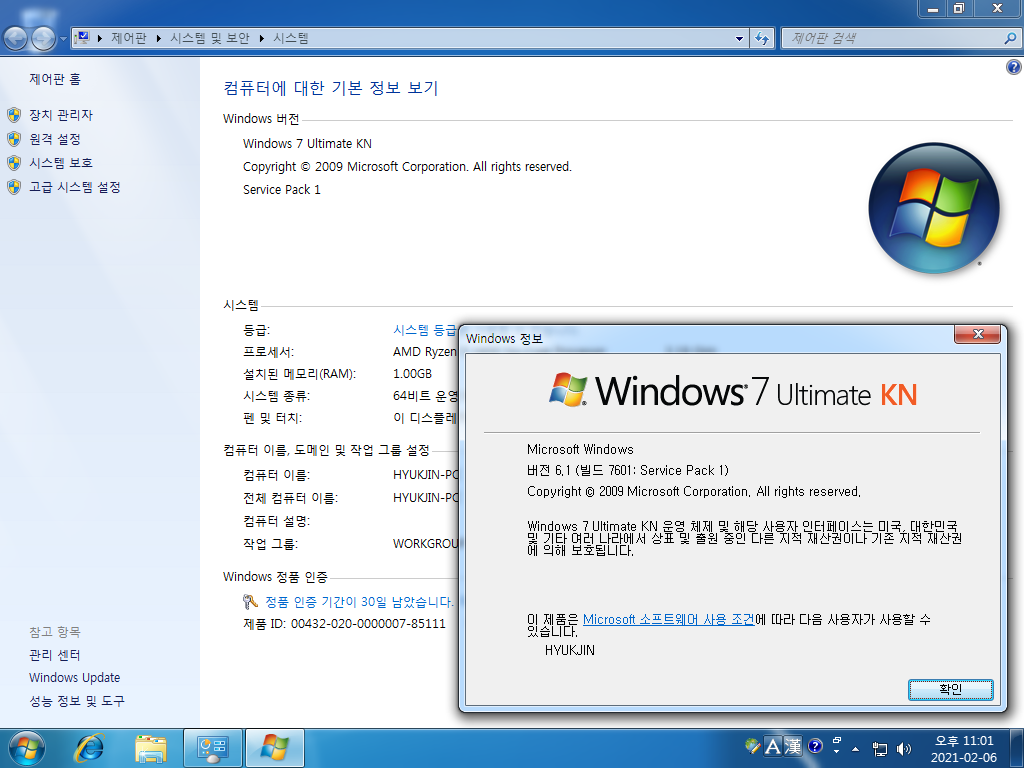 시스템 등록 정보입니다. 윈도우 7 얼티밋 KN입니다. 빌드 넘버는 6.1.7601입니다. 서비스 팩 1이 설치되어 있습니다.