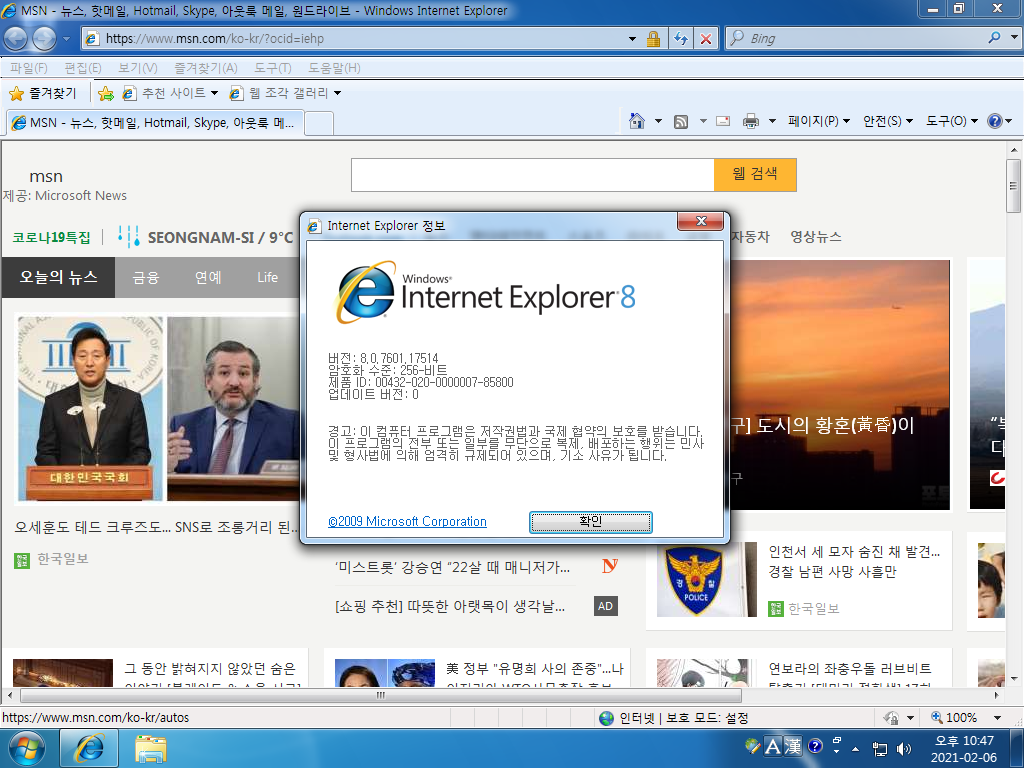 인터넷 익스플로러입니다. 버전 8이고, 빌드 넘버는 8.0.7601.17514입니다. 윈도우 7은 IE 11까지 지원합니다.