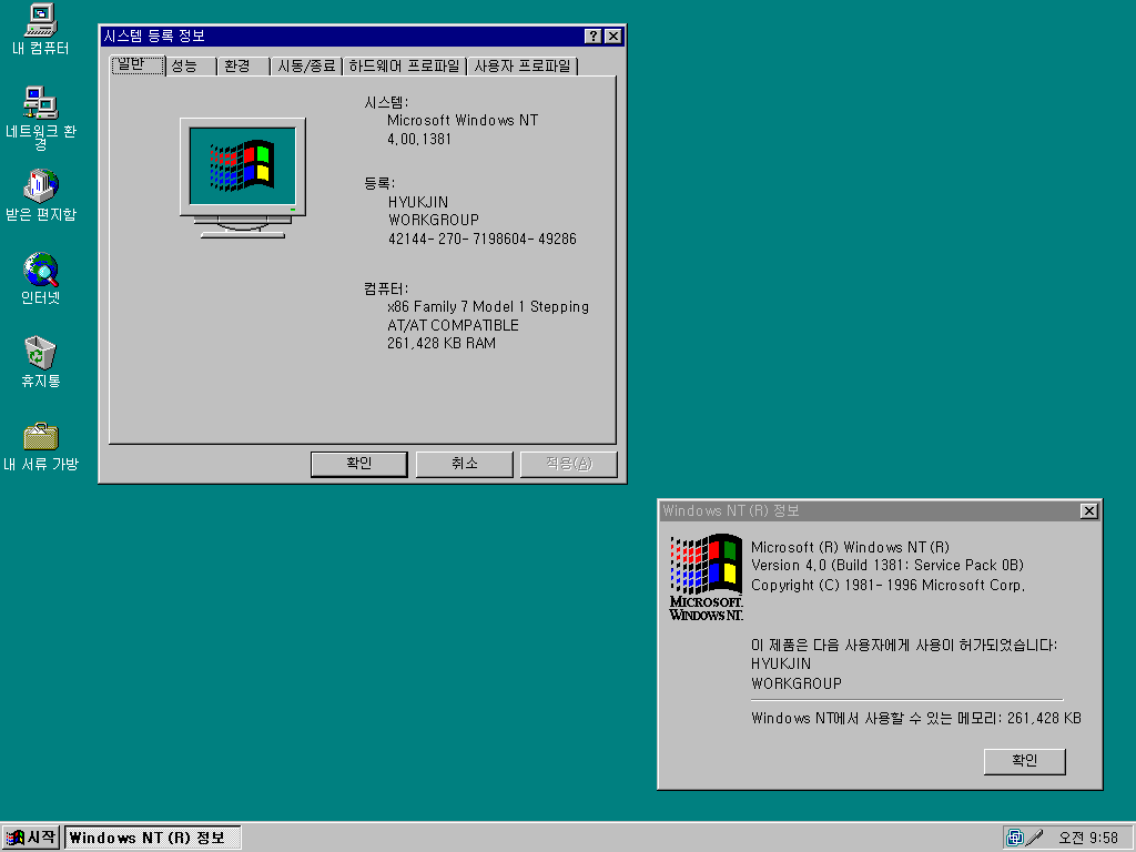 시스템 등록 정보입니다. 윈도우 NT 서버 4.0, 빌드 넘버는 4.00.1381입니다. 서비스 팩이 없는 베타 버전입니다.