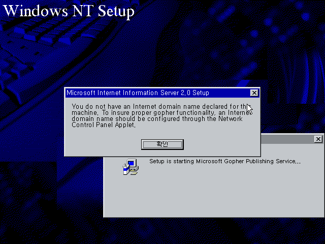 인터넷 도메인 이름을 설정하지 않았다는데, 그냥 확인을 눌러줍니다.